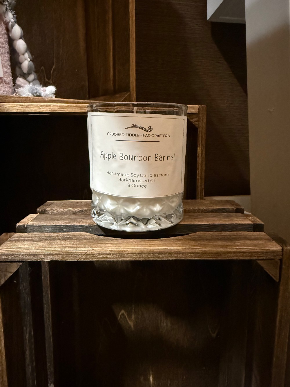 Sold By: Crooked Fiddlehead Crafters ALl Natural Soy Candle 8 oz Apple Bourbon Barrel