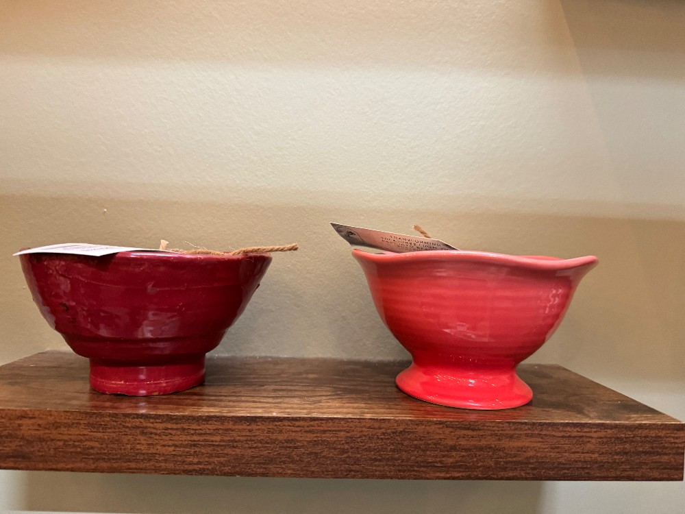 Ceramic Style Vessels and hand pour pottery Both Refurbished, Your choice Redish Brown Hand Poured or a sculpted Orangish colors bowl with scalloped edge on a little base with Calming crystals set into the wax both hand poured candles have The Majestic Strength of redwood Belnded with Lush freshness of moss - earthy grounding aroma that brings the serenity of the forest indoors