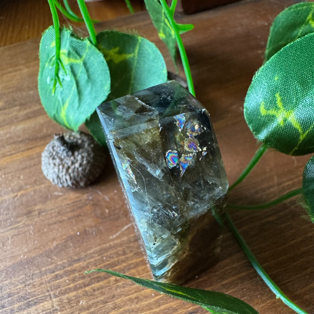 Labradorite Crystal Polyhedron. A stone of magic, intuition, & protection. Labradorite is known to act as a shield while supporting transformation, supports connection with guides, & helps you trust the unseen as you step into your power. Measuring 2 inches.