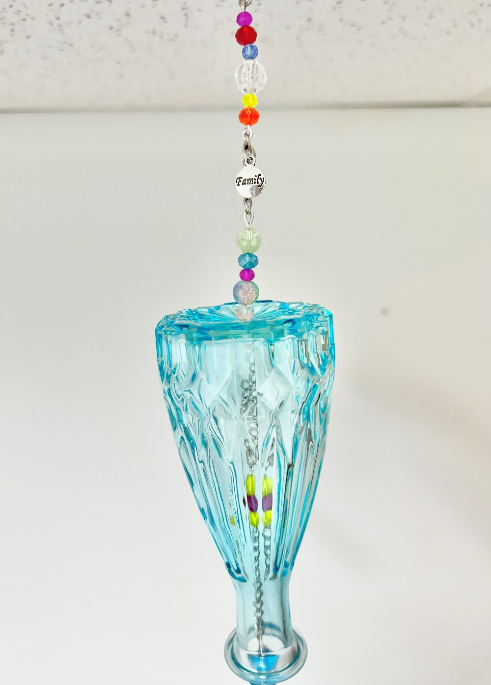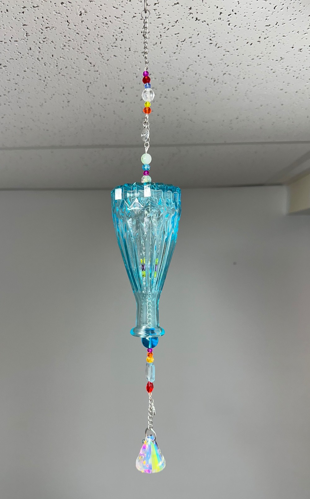 Blue bottle wind chime with crystal beads/pendant. Inside use or well protected outside area. Hang in a sunny window for best light reflecting.