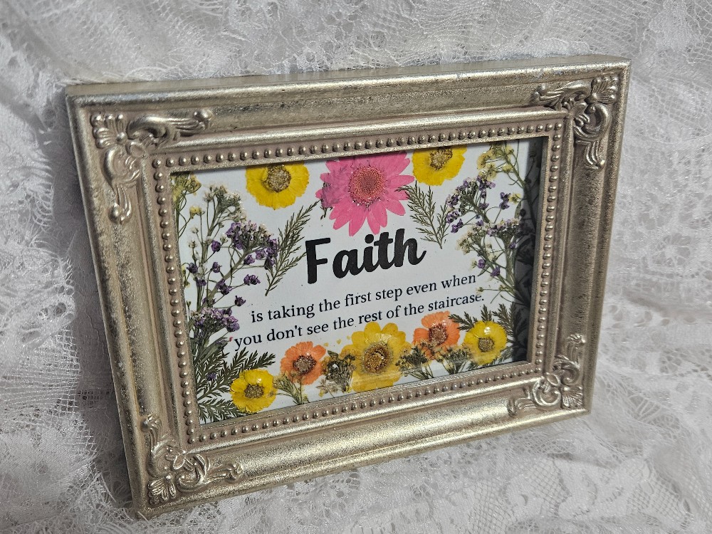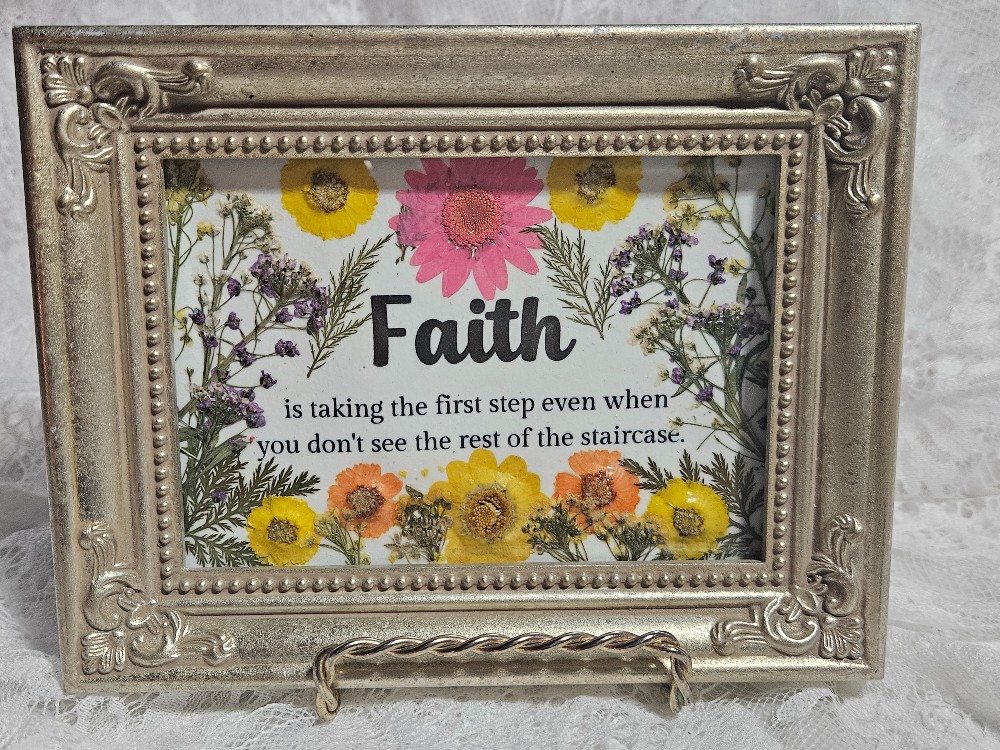 7 x 5 1/2" floral collage with the quote "Faith is taking the first step even when you don't see the rest of the staircase."
