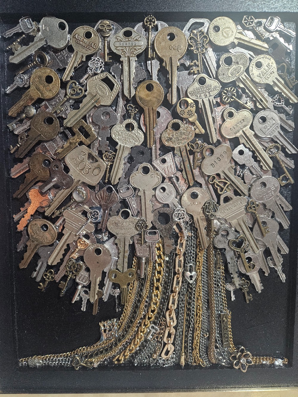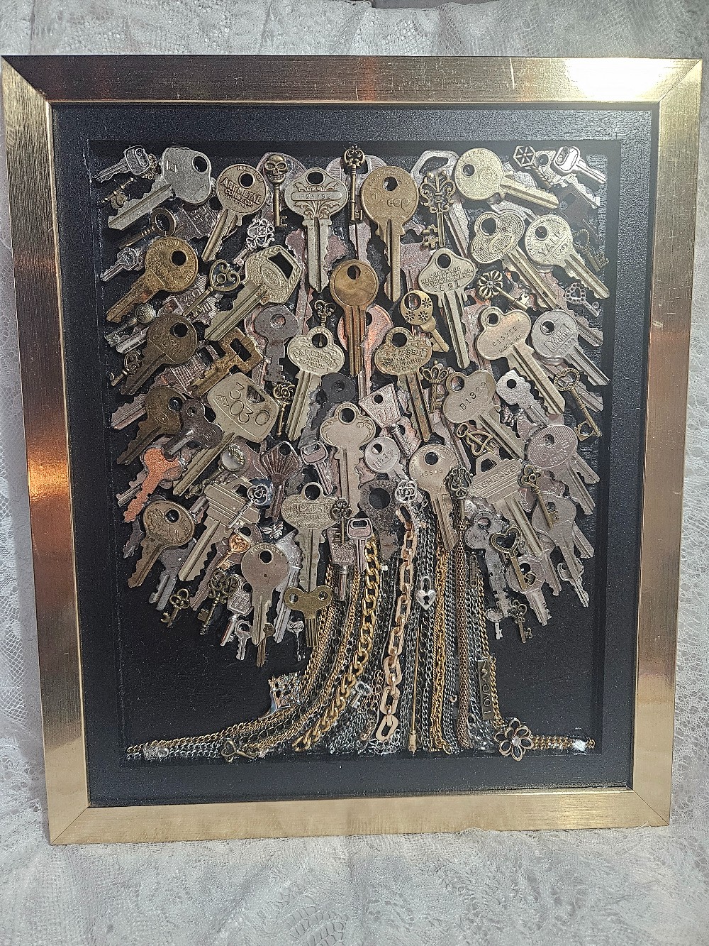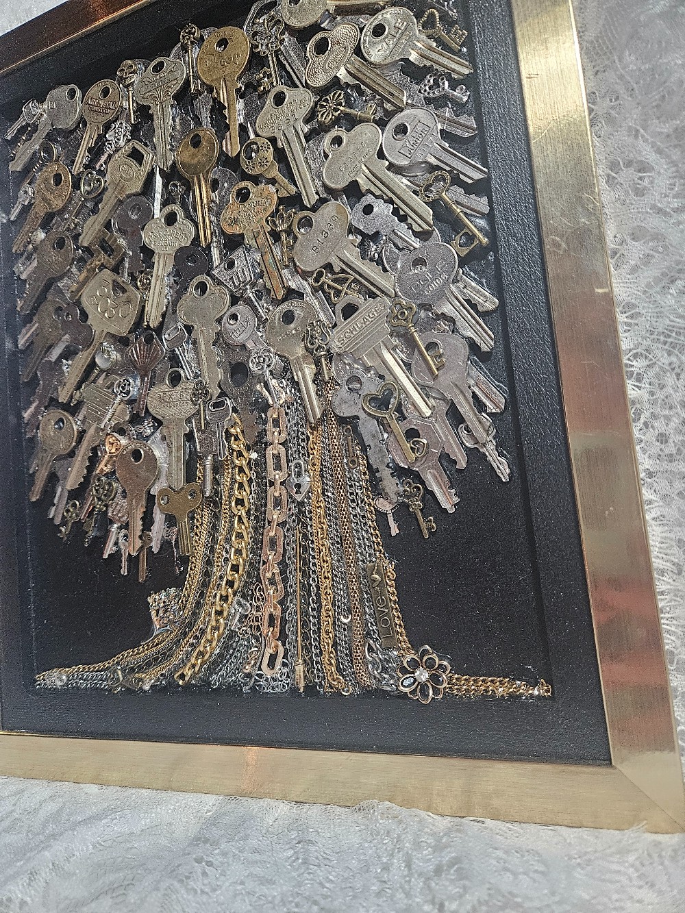 Gold framed collage of a tree made from vintage & antique keys, necklaces, and found objects. Frame is 14x11".