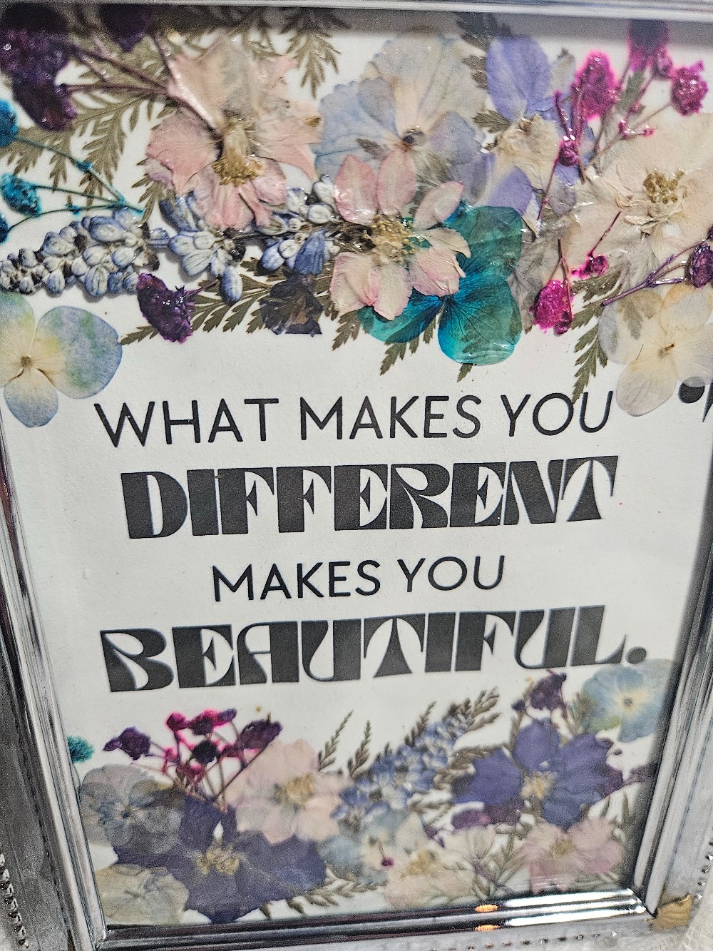 8 1/2 x 6 1/4" framed floral collage with the quote "What makes you different makes you beautiful."