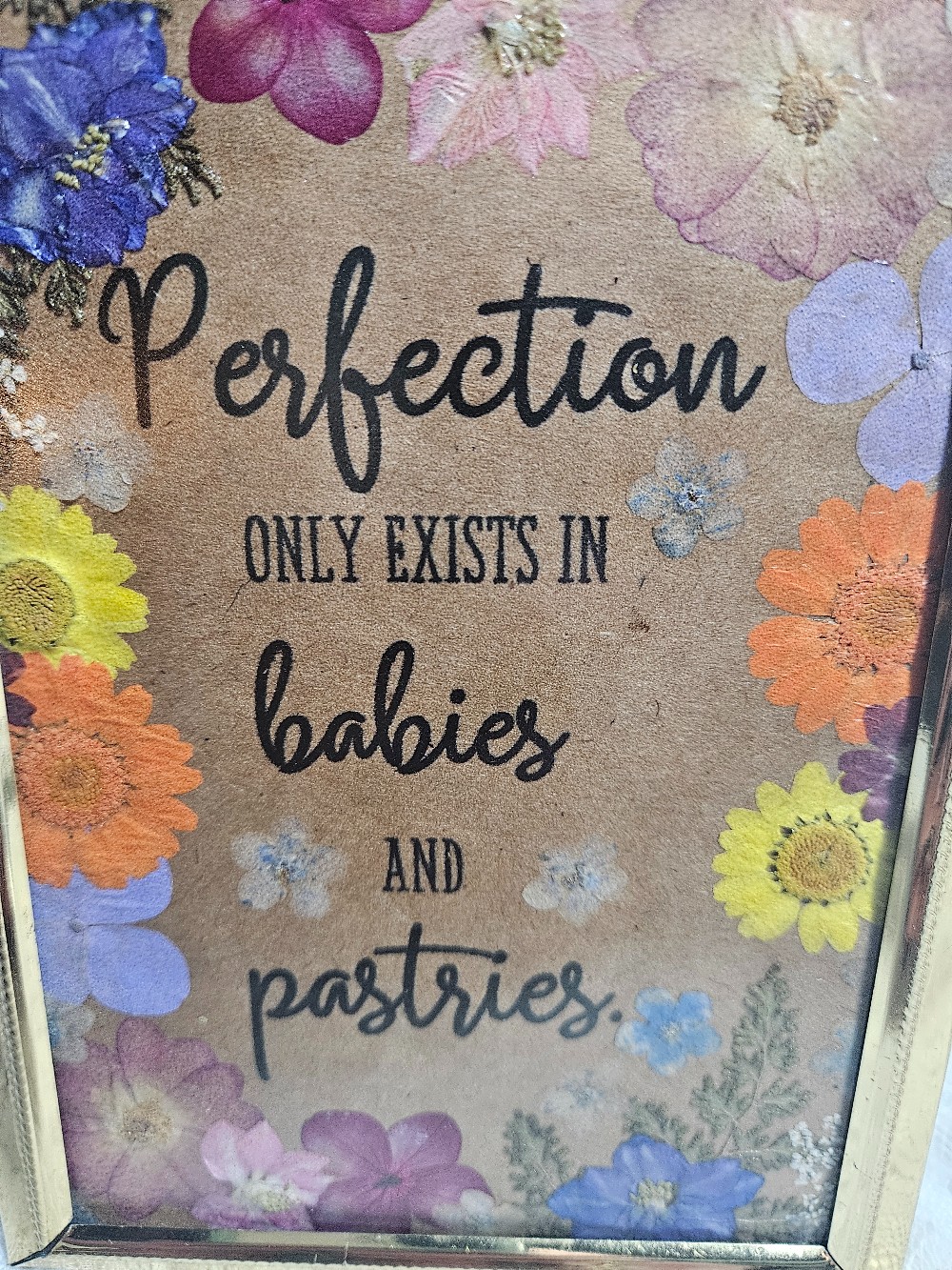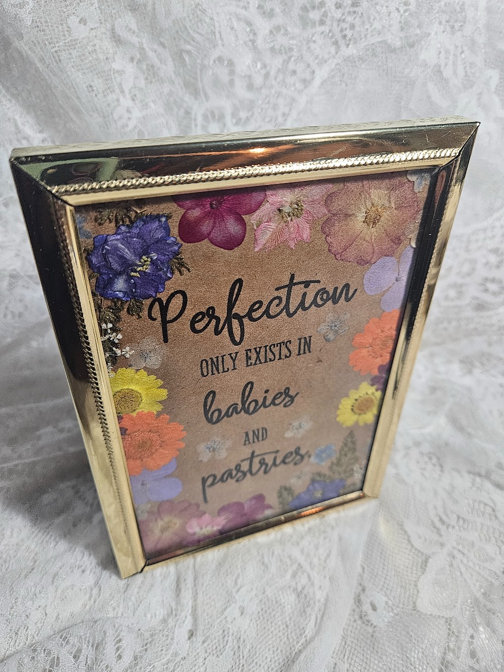 7 1/4x5" framed floral collage with the quote "Perfection only exists in babies and pastries."