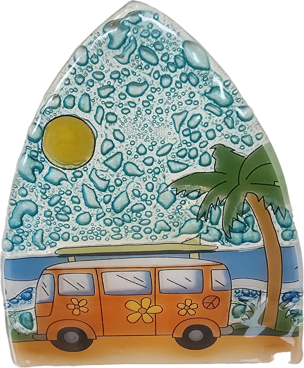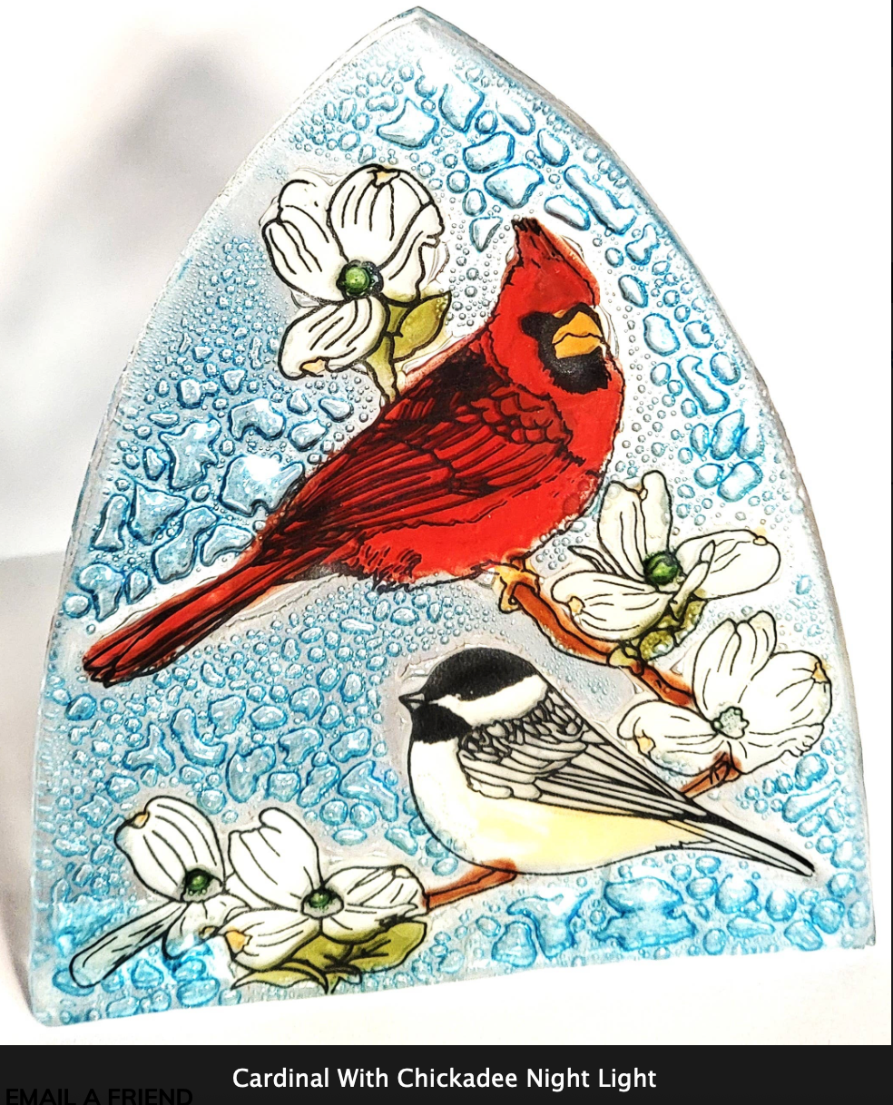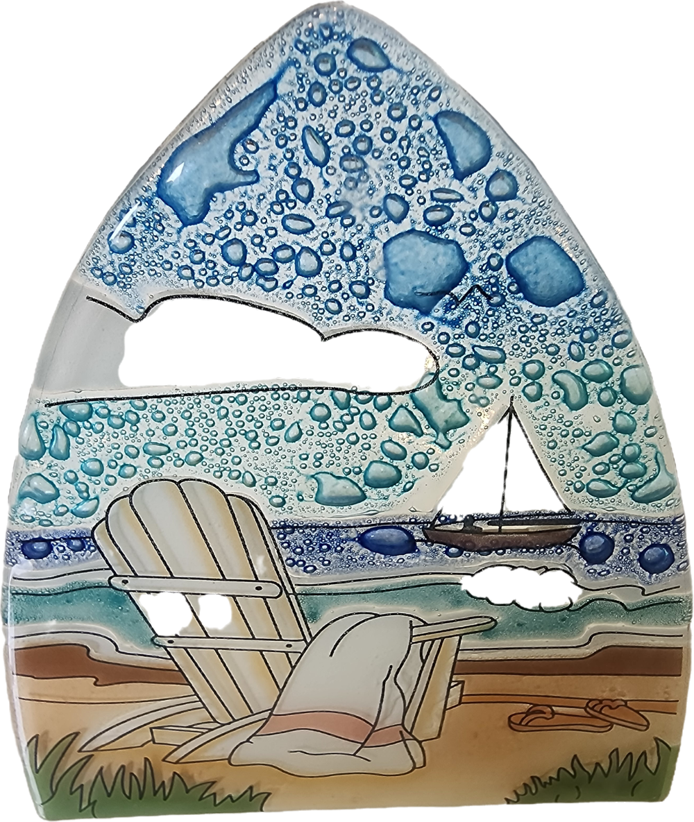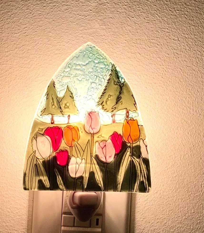 These gorgeous hand crafted night lights are made from recycled glass and fused together to create beautiful scenic pictures and textured bubbles in the glass. It comes complete with a UL rated plug and a bulb.