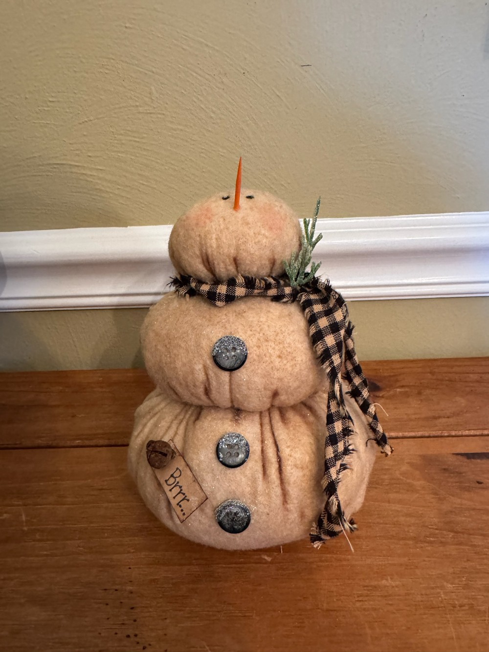 Large grungy prim stuffed snowman with a black and tan homespun scarf. Has buttons, a rusty bell and safety pin and a tag that says "Brrr." Has glitter accents.