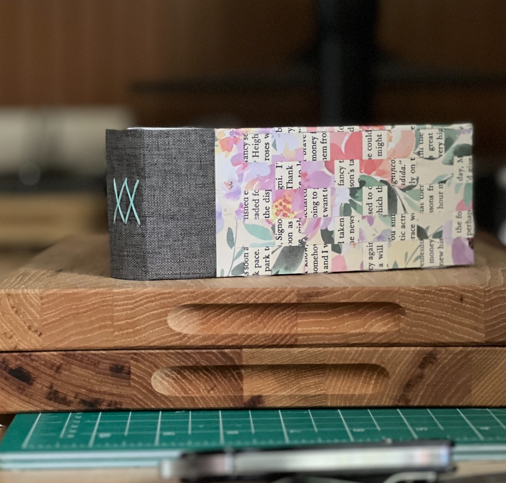 6 x 2.5 Sketchbook. Hand-woven cover using decorative paper and a page from an old Nancy Drew book. Mixed with beautiful gray bookcloth and a heavy mixed media paper, this is truly a one-of-a-kind sketchbook.