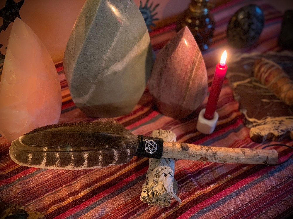 Handmade Alter Fan. Birch wand with two feathers, wrapped with leather, and one charm (charm will vary from fan to fan). Handle is about 8" long, 3/4" diameter. Entire fan is 14"-15" long. Each is hand crafted. No two are the same. Each of our fans carries it's own unique energy and symbolism. Altar fans represent the element of air which governs intellect, communication, clarity and inspiration. Fans are used to honor air deities, east, or energies of the mind and breath, by wafting smoke during cleansing rituals.