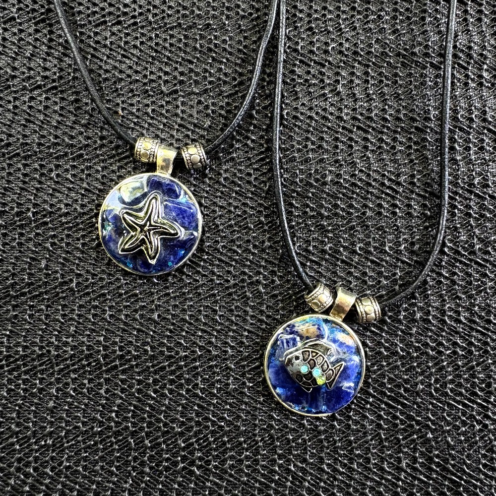 25mm round, silver plated starfish, resin, pendant, necklace with sodalite hangs on an 18" black cord with metal beads and lobster claw clasp