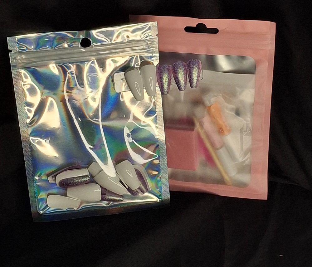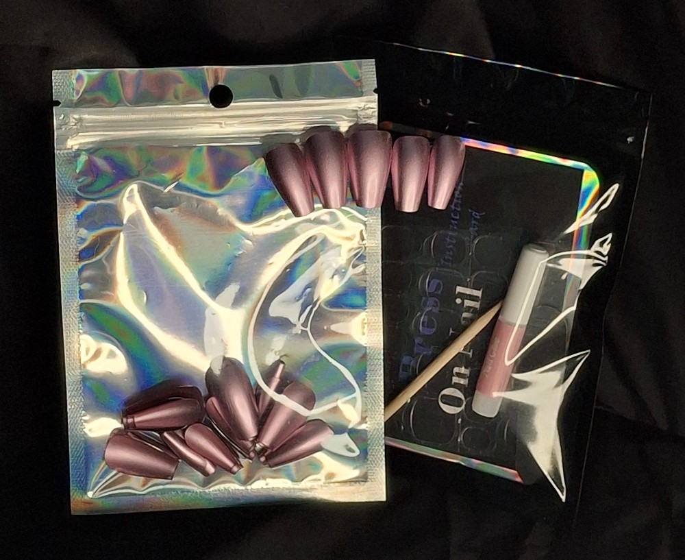 Hand-painted press ons are applied at home using nail glues/adheasive tabs(both provided). These nails are painted with regular polish focused on indie brands.