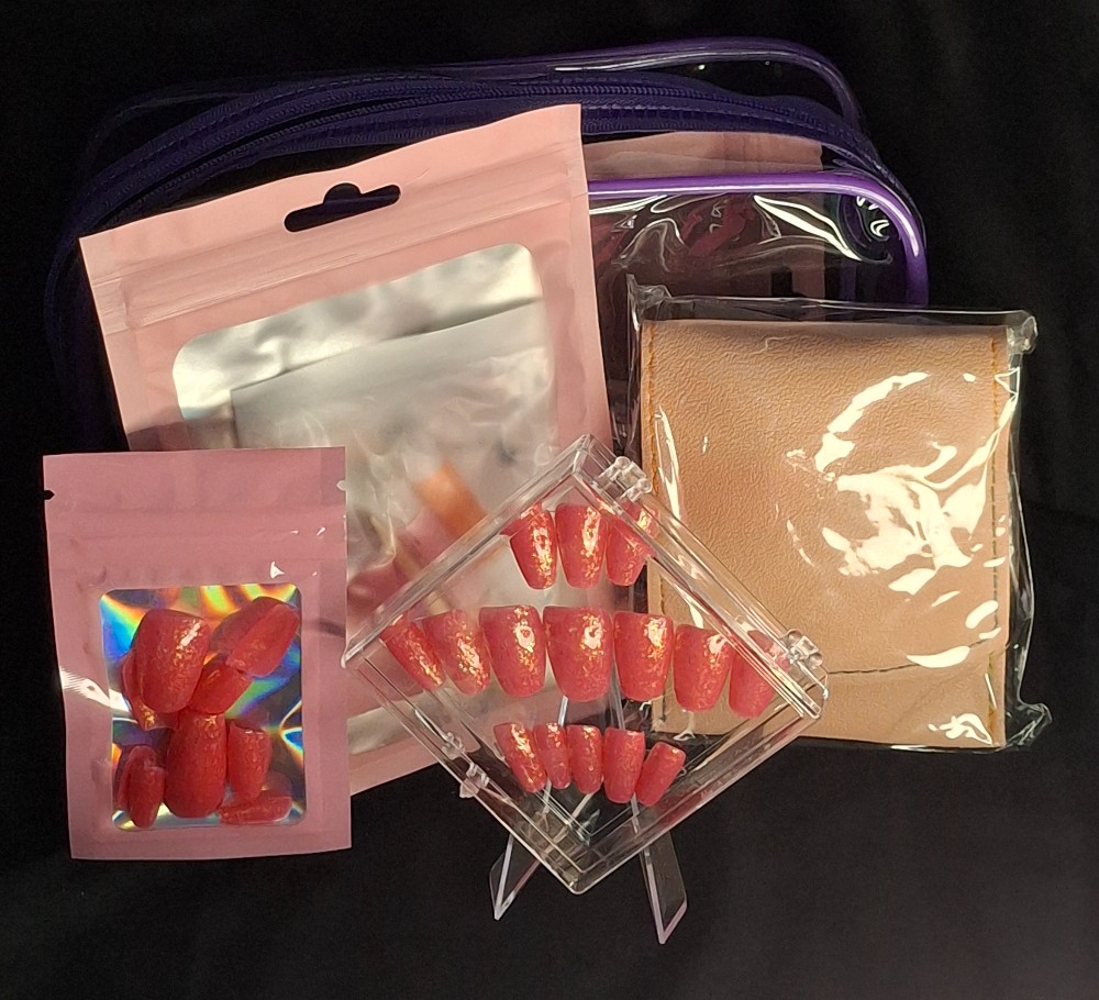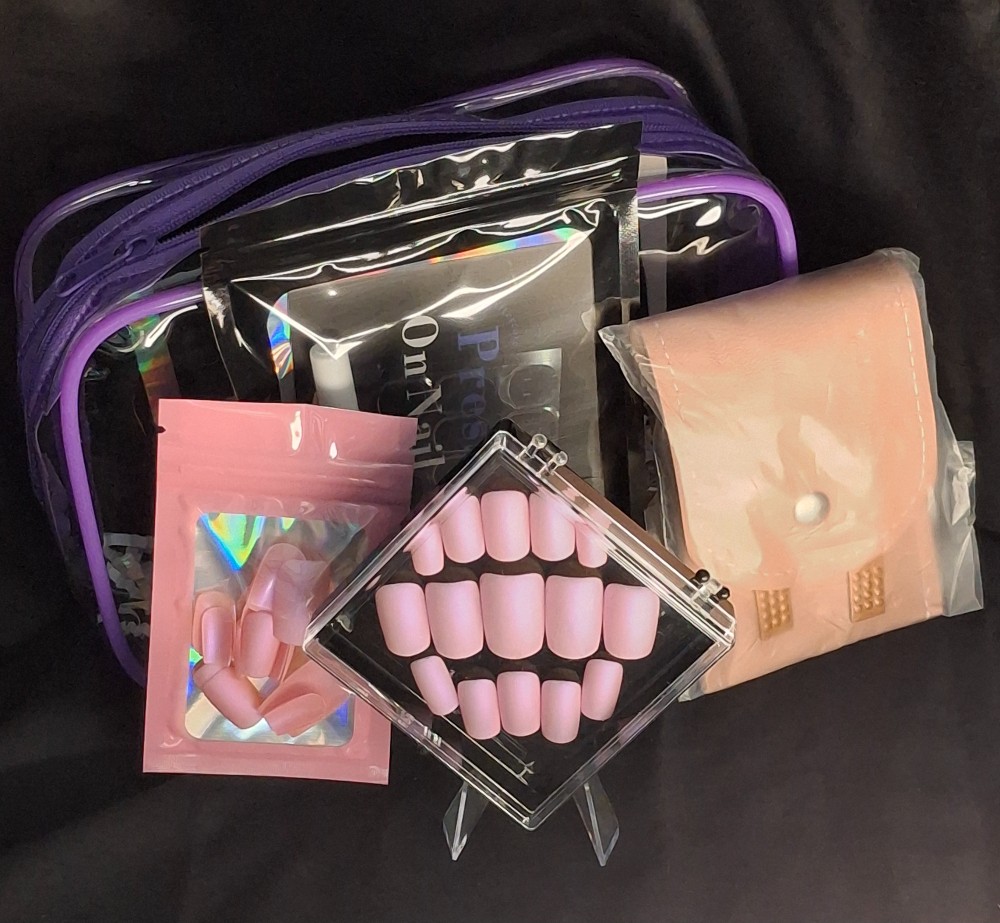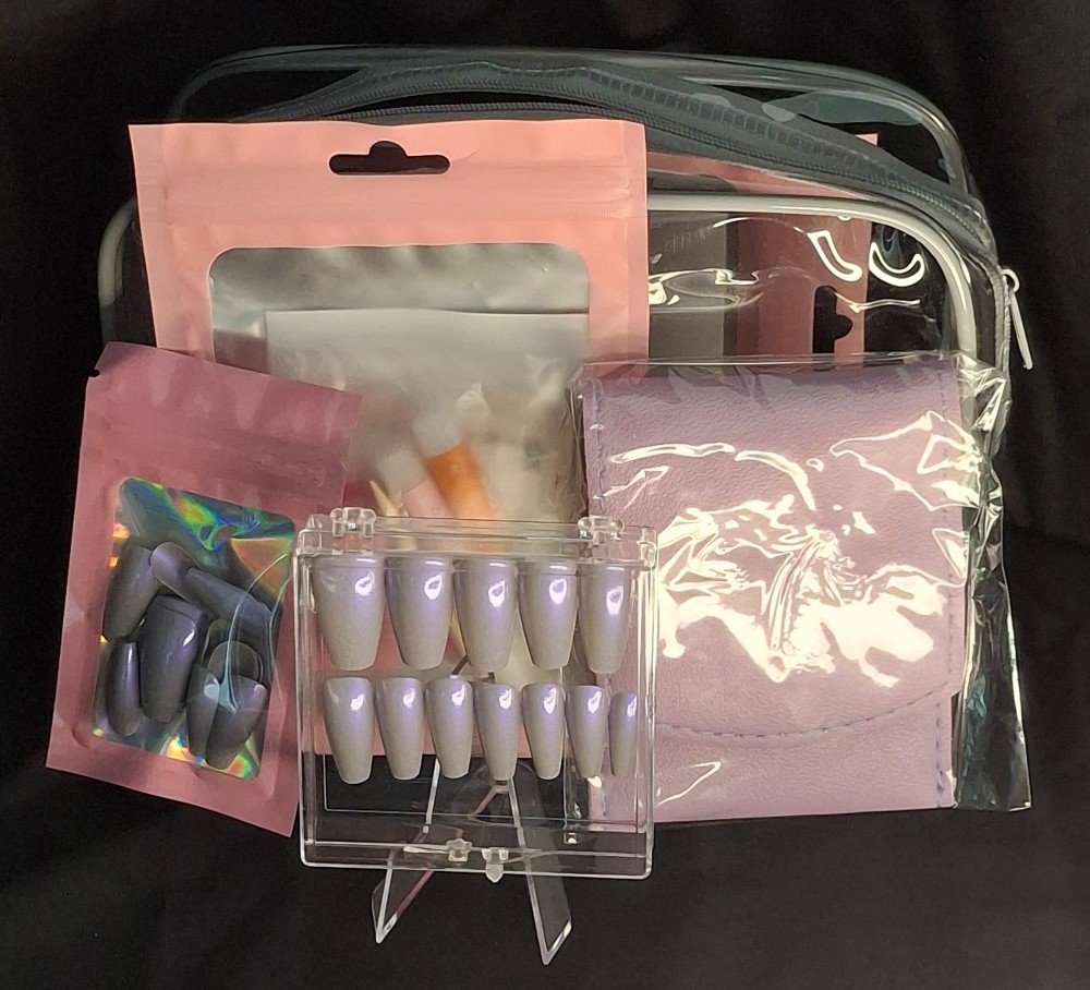 Sold By: Color by Nails Nail Kit that includes : press on nails, nail care kit, bag, and adhesive.