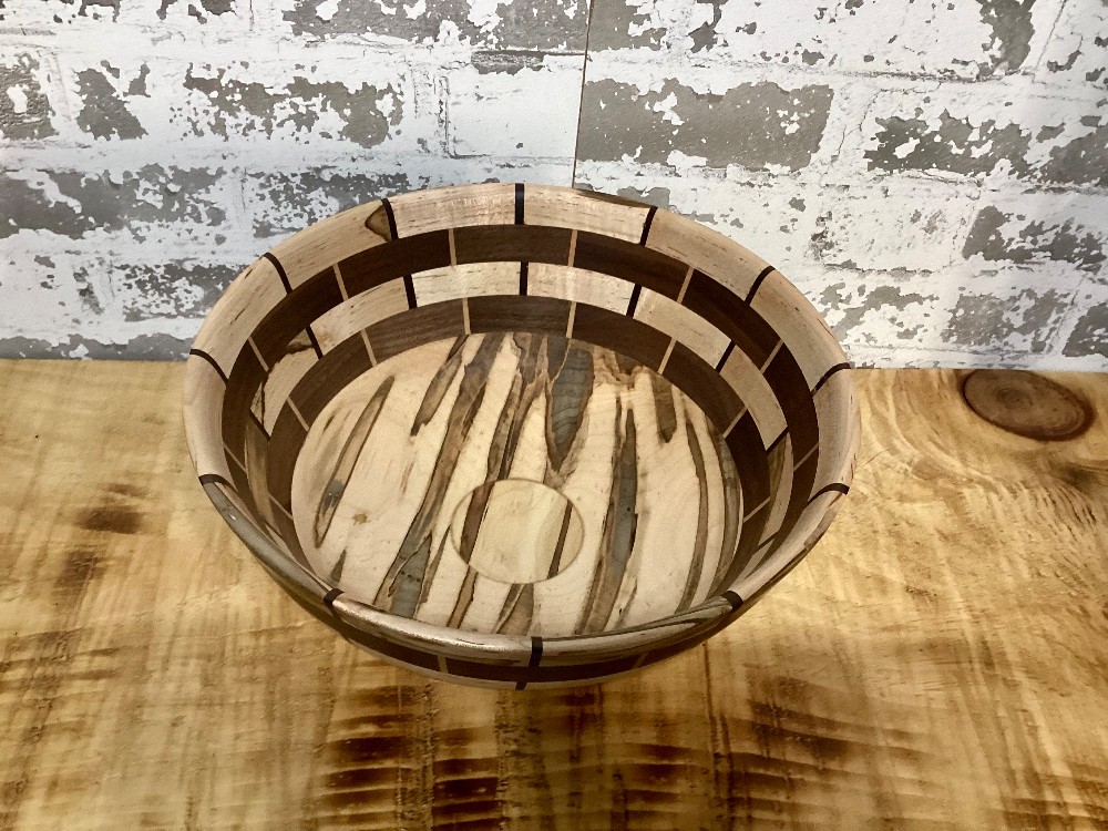 This striking segmented bowl from CB's Creations is a true showcase of craftsmanship and design. Measuring 11 1/2 inches in diameter and 5 1/2 inches in height, the bowl features a pedestal base and is meticulously hand-turned from Ambrosia Maple and Black Walnut. The contrasting tones and grain patterns of the woods create a visually captivating mosaic effect, making this piece both functional and decorative. Care Instructions: Wipe clean with a damp cloth Treat with mineral oil, cutting board oil, or walnut oil to maintain the wood’s natural beauty Not dishwasher, oven, or microwave safe Suggested Uses: Display as a centerpiece on a dining or coffee table Serve dry goods like fruits, nuts, or bread Use as a decorative vessel for seasonal arrangements A thoughtful gift for collectors and lovers of fine woodwork Each bowl is a unique blend of natural materials and skilled artistry—designed to be admired and enjoyed for years to come.